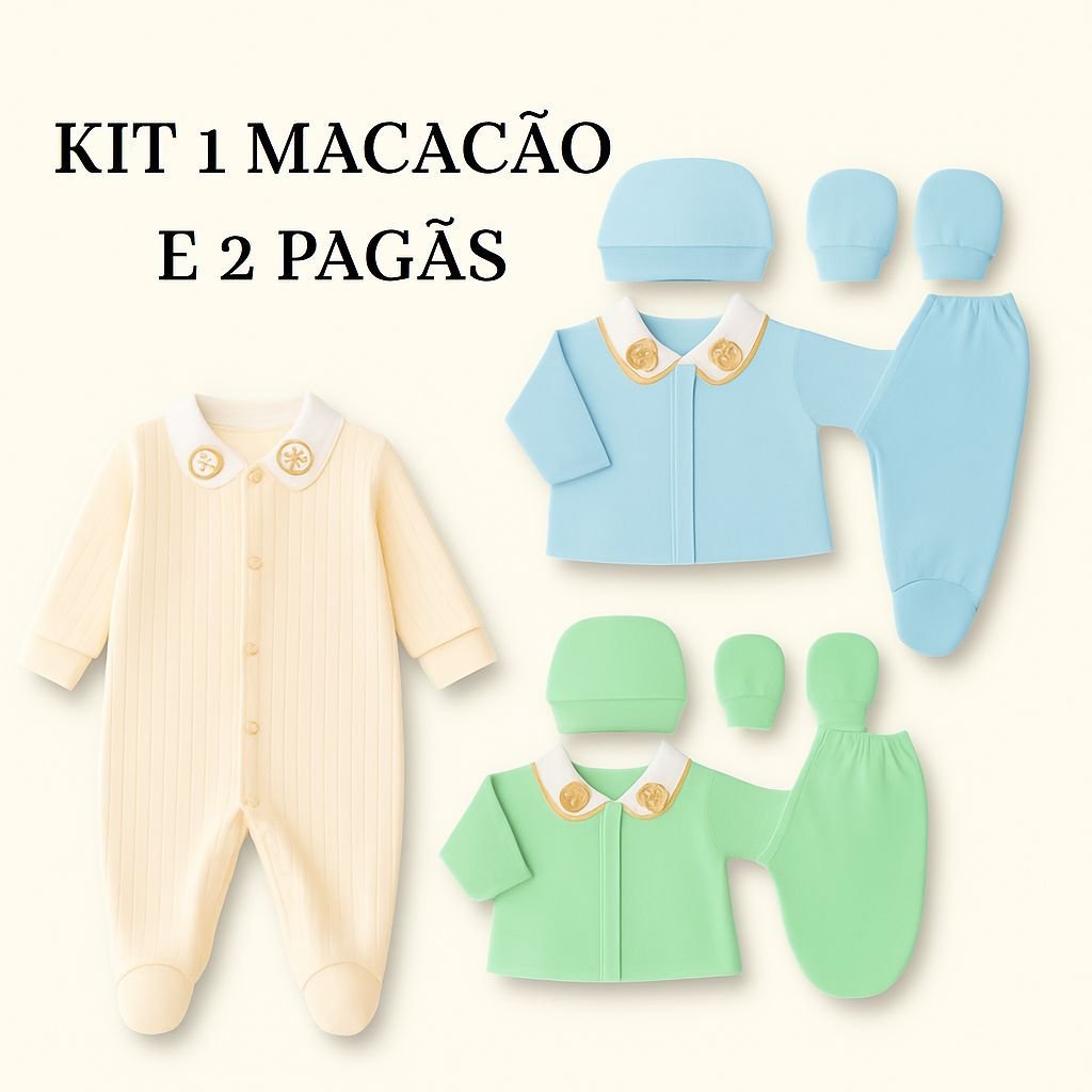 Garanta conforto e muito charme para o dia a dia do seu bebê com o nosso kit! Ele vem com 1 macacão super macio canelado, perfeito para manter seu pequeno protegido e confortável, além de 2 pagãs versáteis, TUDO 100% ALGODÃO