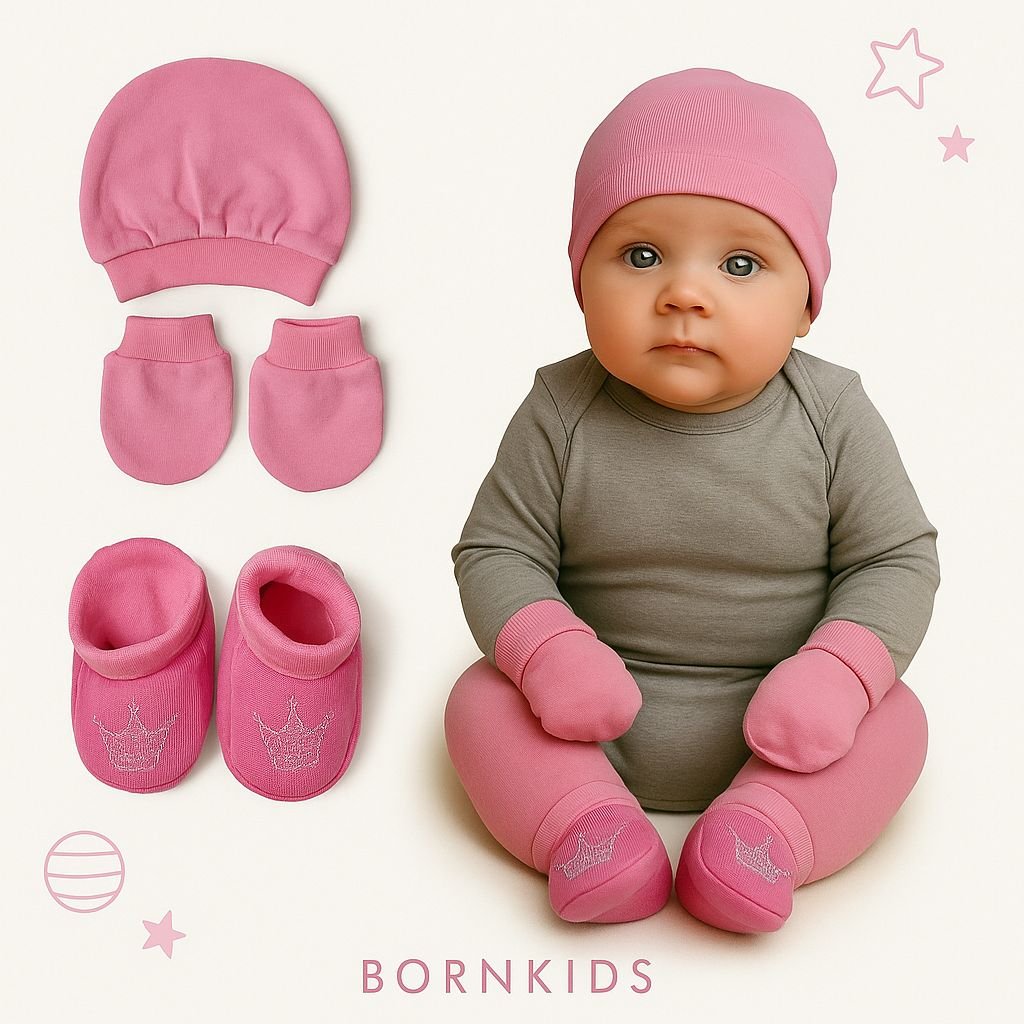 Kit para bebê touca, luvas e sapatinhos – em 100% algodão.