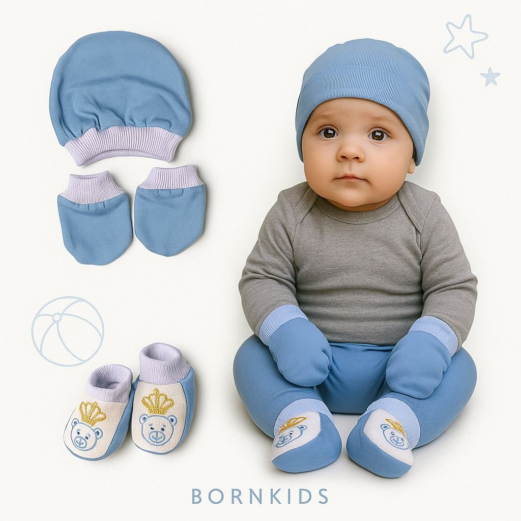 Kit para bebê touca, luvas e sapatinhos – em 100% algodão.